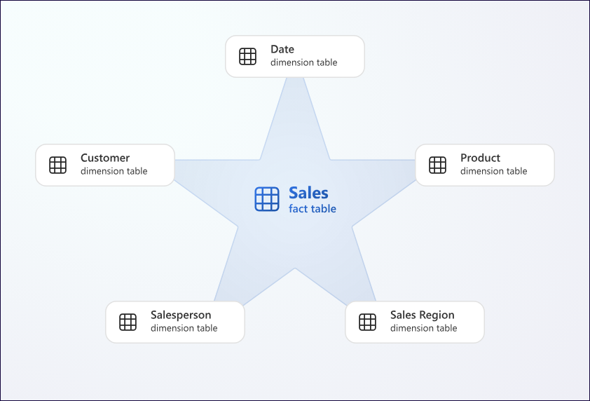 Fato_Venda). - Em volta: as tabelas dimensão (
